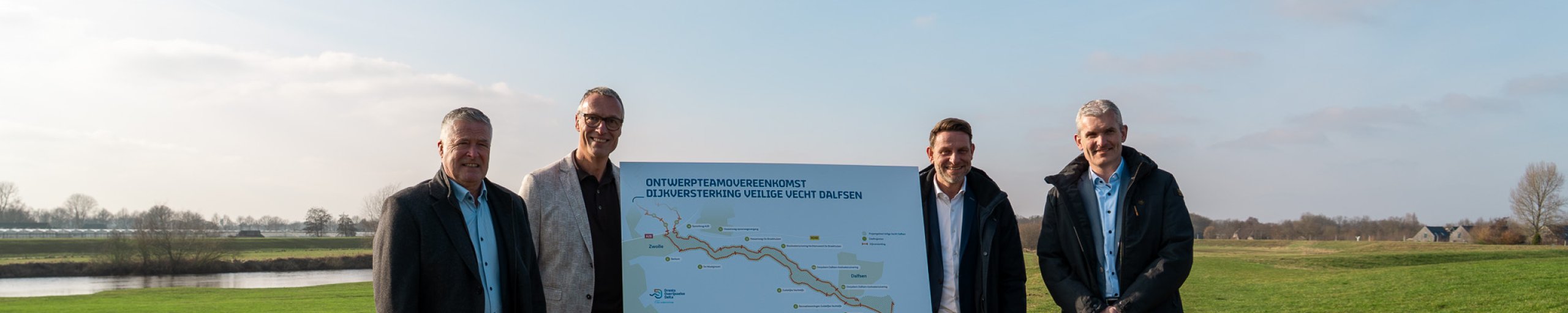 De dijkversterking Veilige Vecht wordt uitgevoerd door aannemerscombinatie Vechtdijkenensemble. Deze combinatie bestaat uit de partijen GMB, Heijmans en DEME. Met Waterschap Drents Overijsselse Delta (WDODelta) rondt de combinatie eerst de plannen af voor de dijkversterking langs de Vecht tussen Dalfsen en de A28 bij Zwolle voordat vanaf medio 2028 gestart wordt met de uitvoering. Woensdag 18 februari zetten dagelijks bestuurslid Hans Wijnen van het waterschap en Edwin van der Poel (GMB), Sander Dekker (Heijmans) en Jaap van der Weele (DEME) namens het ensemble hun handtekeningen onder het contract.