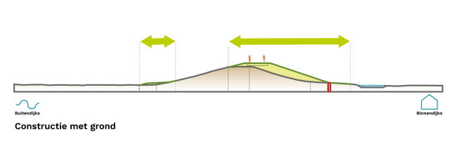 Voor dit deel van de dijk is de hoofdoplossing constructie met grond. Dit alternatief vraagt minder ruimte dan de andere alternatieven, waardoor de impact op de omgeving relatief beperkt blijft. De dijk behoudt haar huidige vorm en uitstraling, wat bijdraagt aan de herkenbaarheid van het landschap. Om de dijk goed te kunnen beheren is aan de rivierkant van de dijk een aanpassing nodig aan de onderhoudsberm.