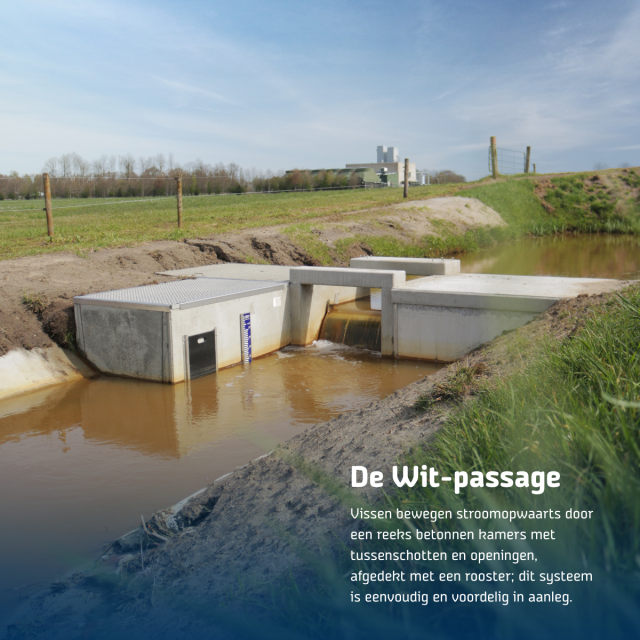 Hier gaat het waterschap aan de slag met vijf zogeheten ‘De Wit-passages’. Hiermee zwemmen vissen stroomopwaarts door een reeks betonnen kamers en openingen, afgedekt met een rooster. “Met dit systeem hebben we positieve ervaringen”, aldus Pereboom.